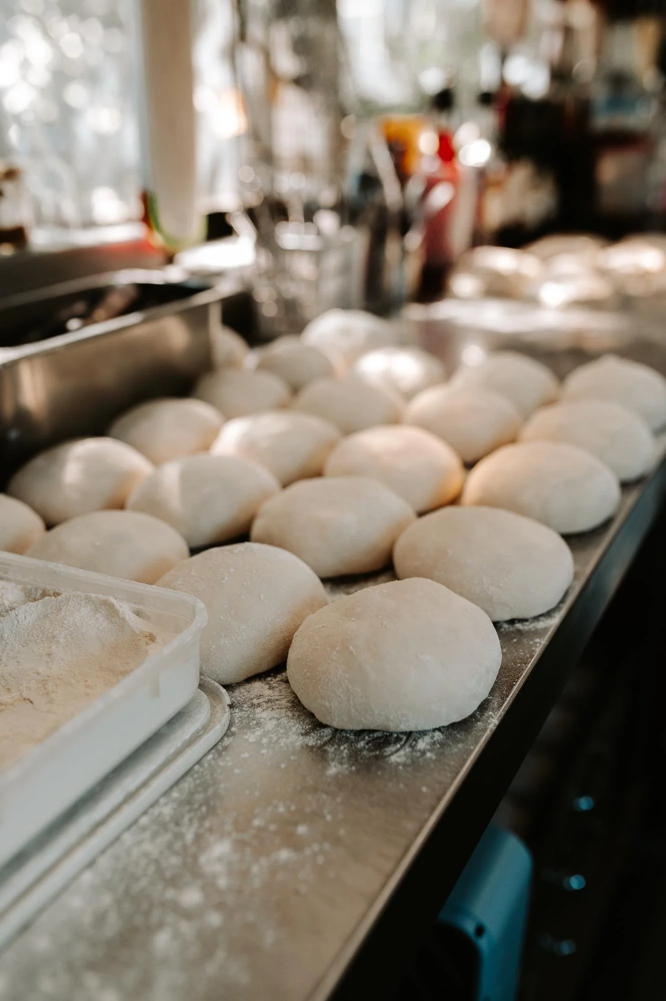 Each portion is hand-cut and gently rounded into individual dough balls, then left to relax again before service. When it’s time to bake, the dough is opened by hand — never rolled — preserving the air inside so the crust rises beautifully in the heat of the oven.